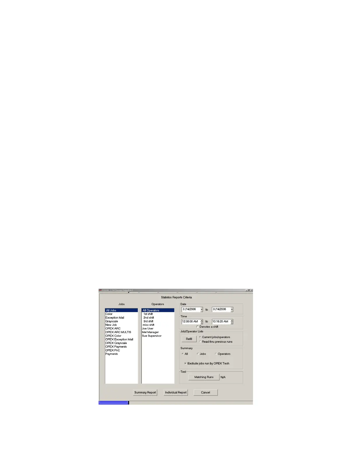 • Summary Reports - Provide information on a job range defined in the Statistics