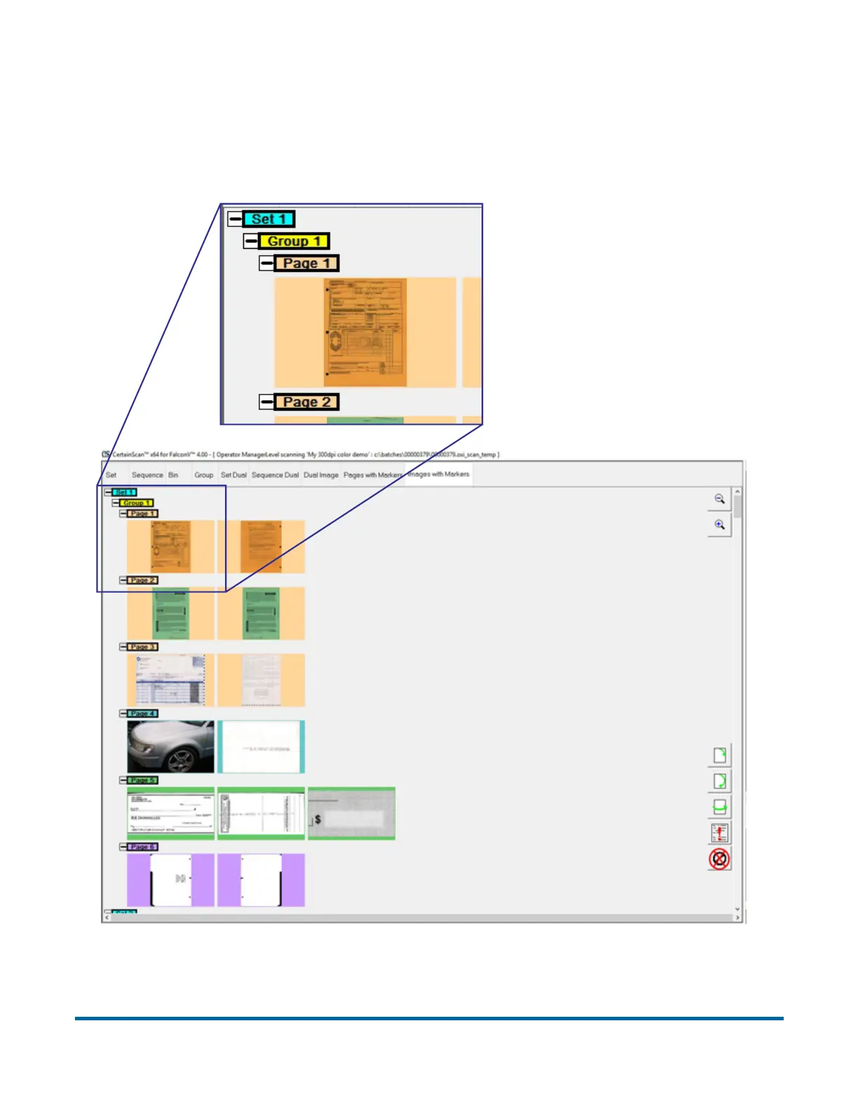 showing the separation of sets, groups, and pages in the batch. Page markers