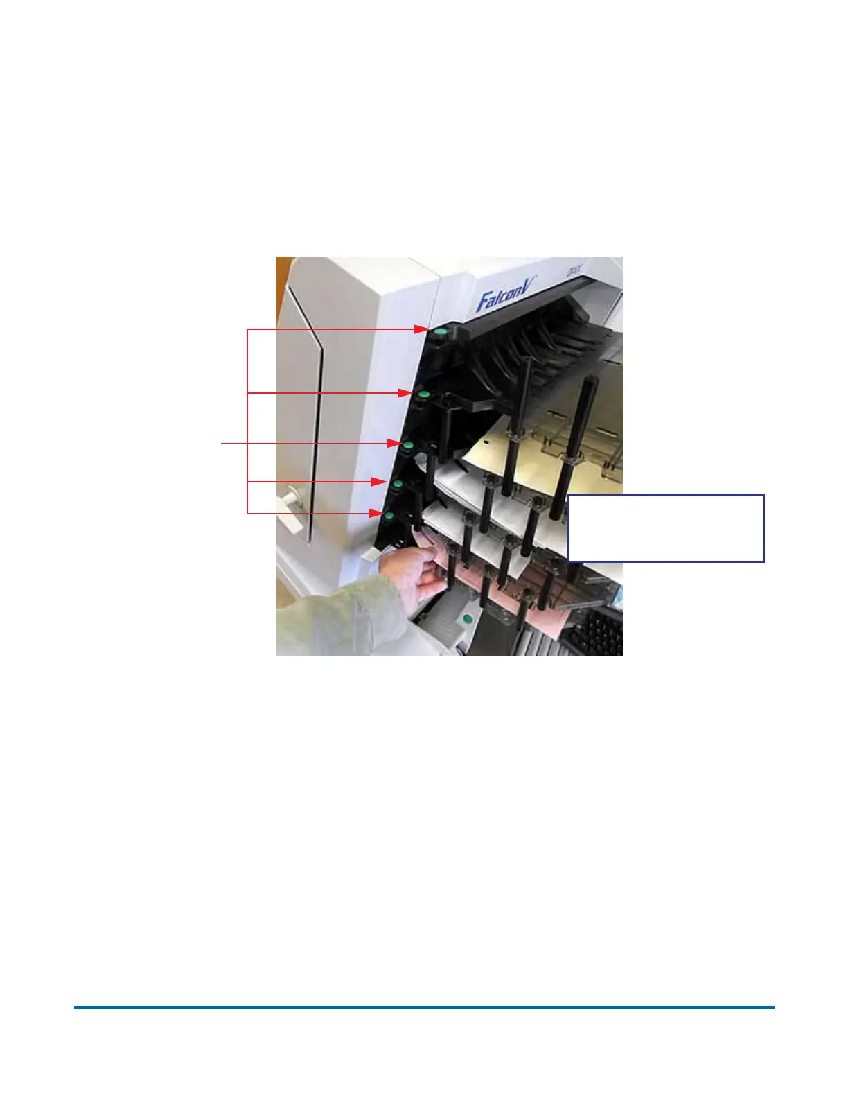 pages. Pressing the green release buttons (one for each bin) will lift the knock-