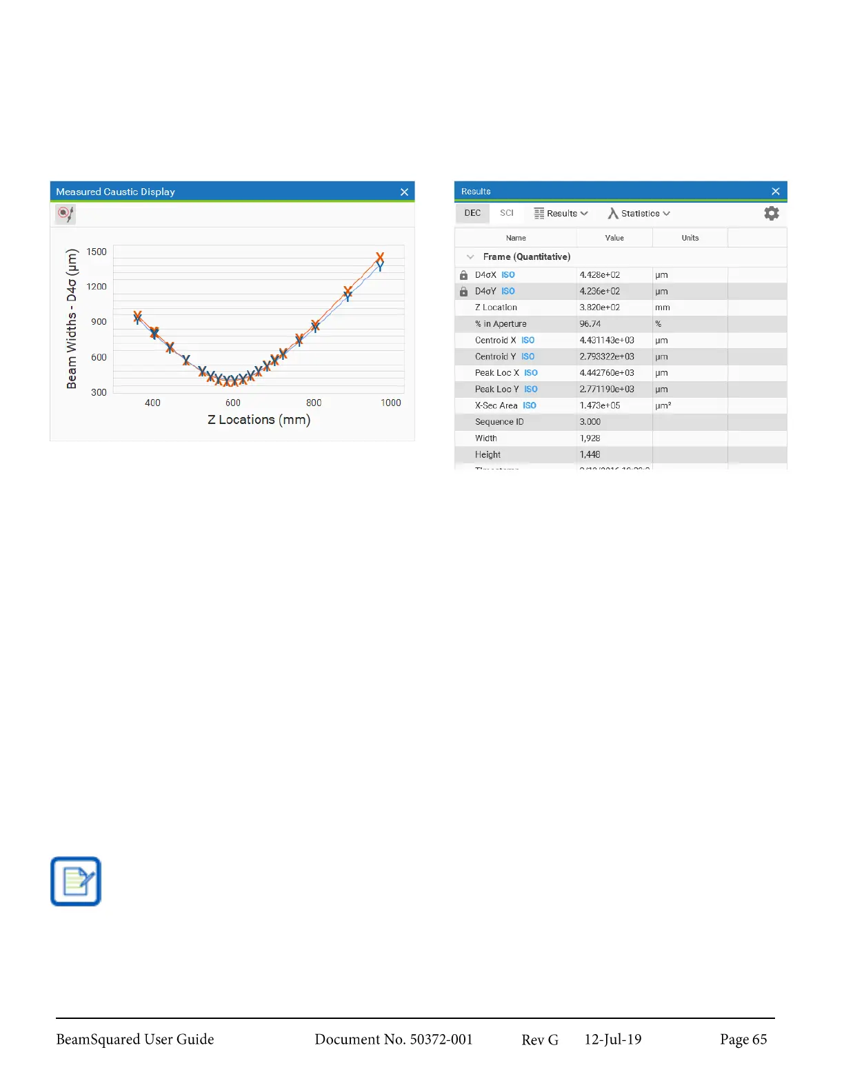 two plotted fits to the data appear in the caustic window. This plot shows the beam widths as functions of Z