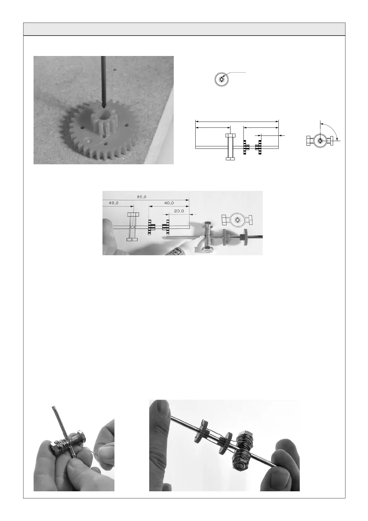 6.3.3 Glue the drilled double gear on the shaft 40mm in. Slide and glue on the second gear