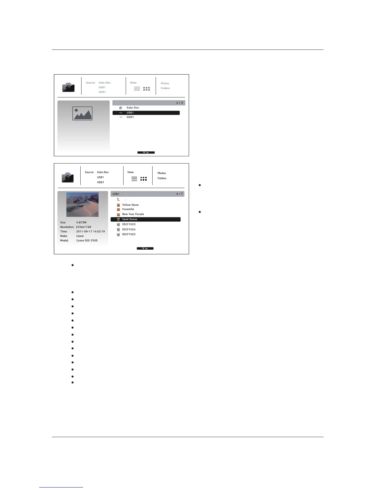 When a photo file is highlighted by the cursor, press the ENTER or PLAY button to play back