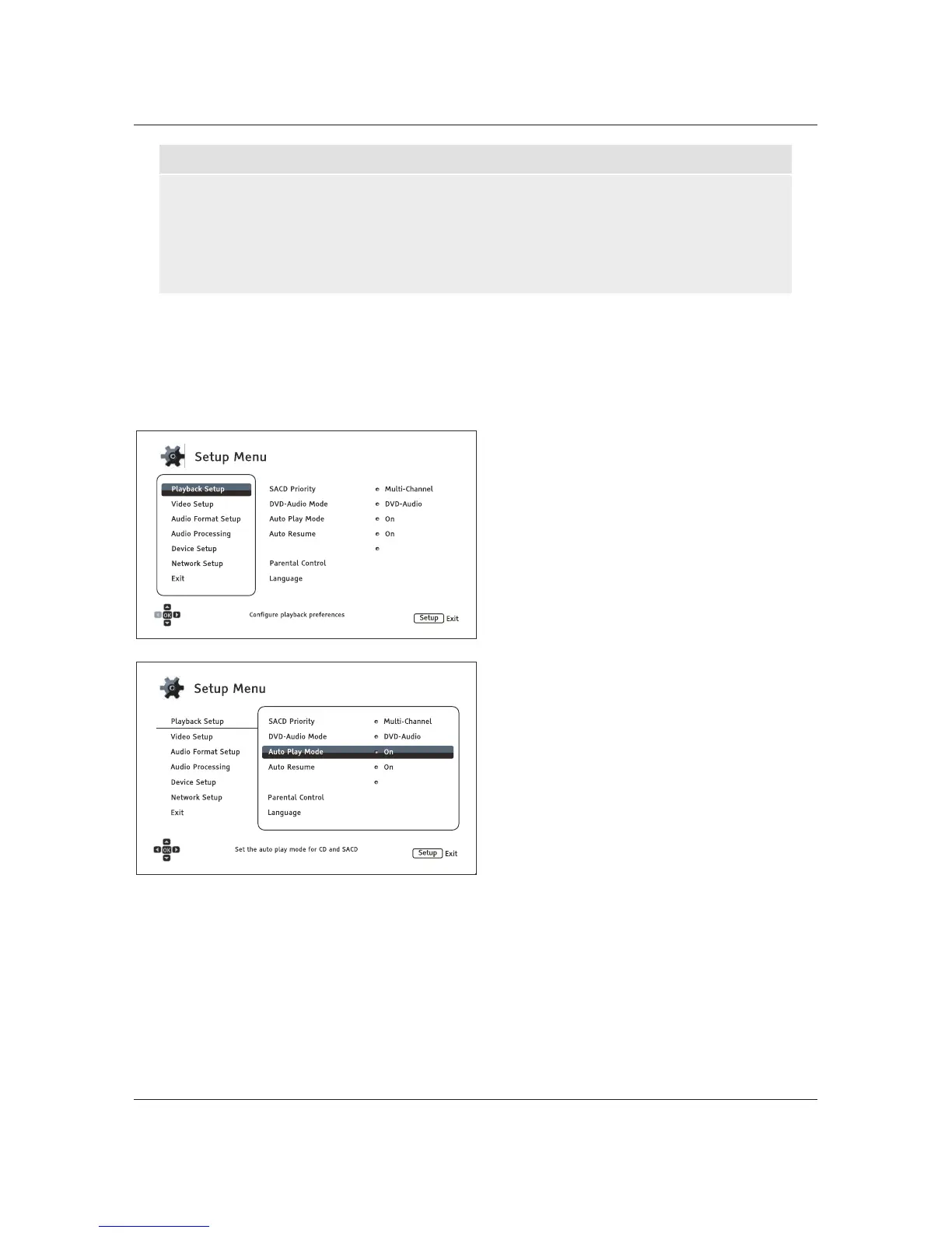 To access the player’s Setup Menu simply press the SETUP button on the remote control. Since some Setup