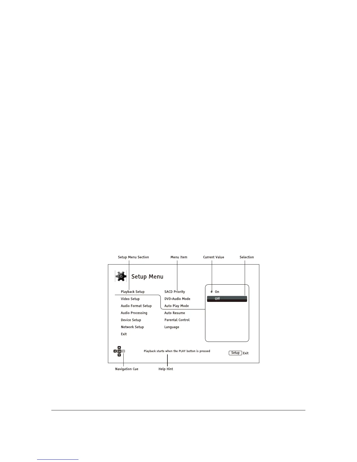 sections listed in the left column of the Setup Menu: Playback Setup, Video Setup, Audio Format Setup,
