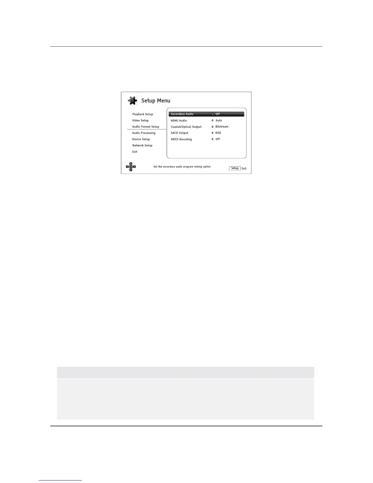 The Audio Format Setup section of the Setup Menu allows you to configure preferences for audio output