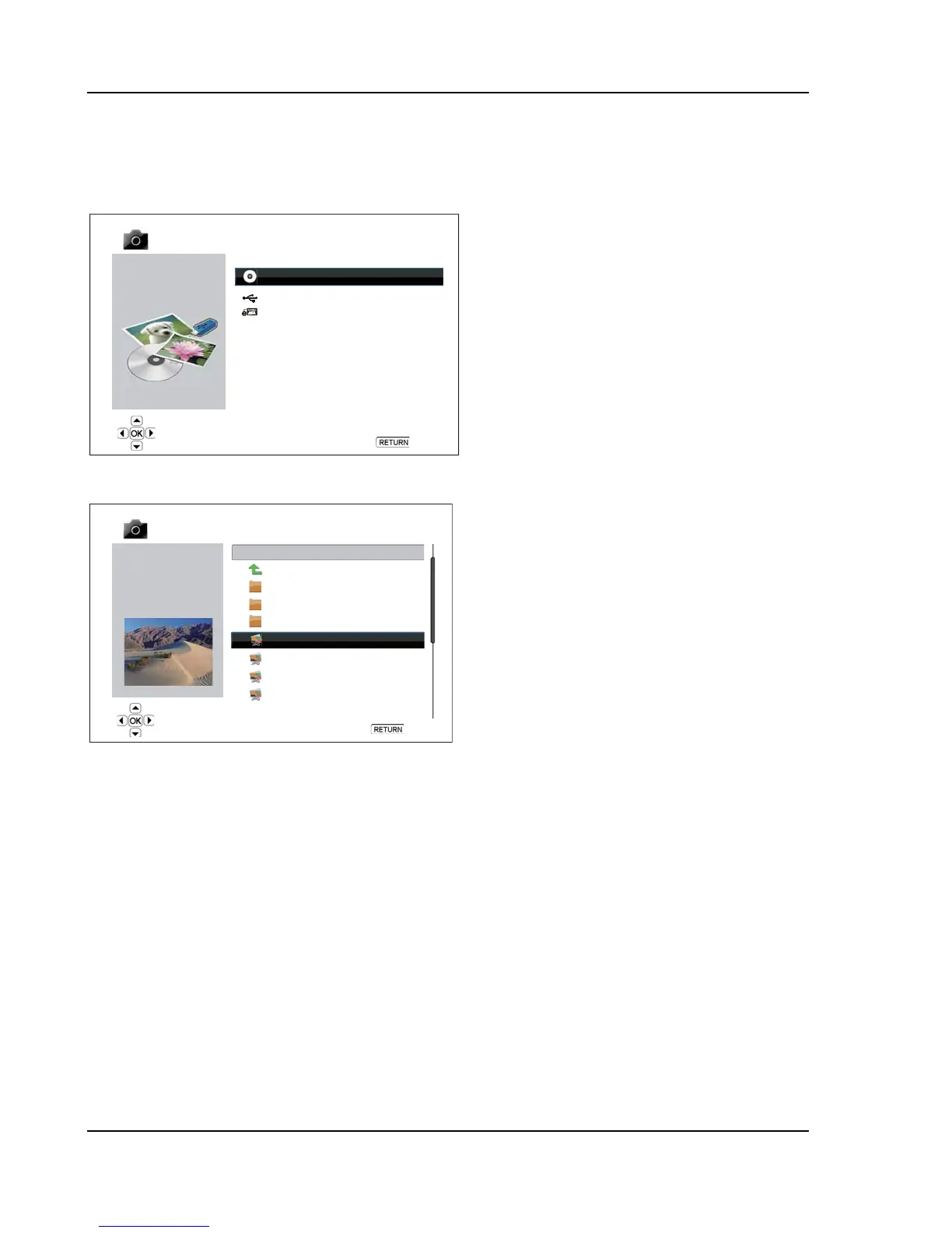 To view digital photo files stored on an optical disc, USB or e-SATA drive, select “Photo” from the Home Menu.