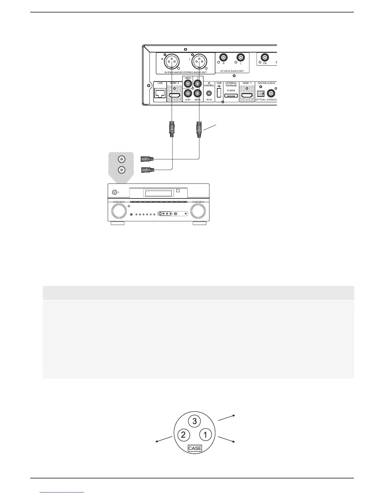 Three-pin (XLR3) cables are needed, and the XLR terminals on the player are male type.