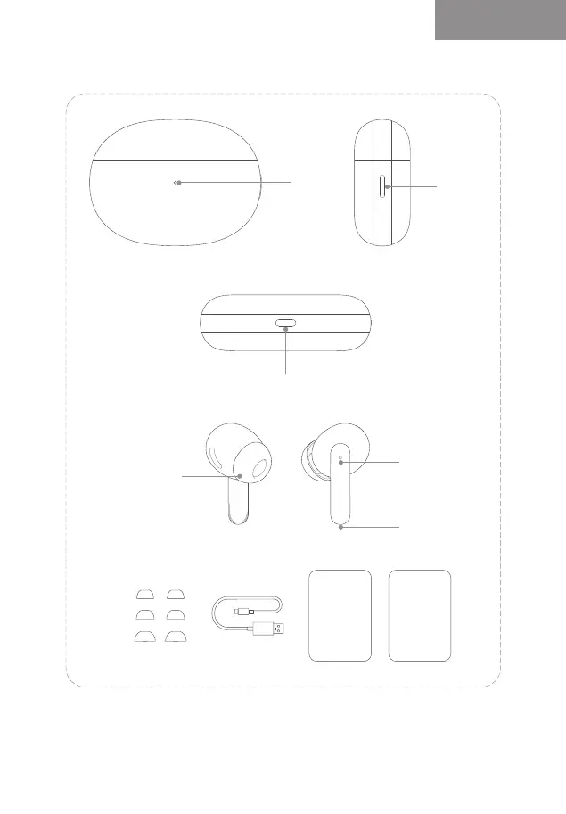 tailles (les embouts de taille M sont livrés montés sur les écouteurs-boutons), un câble de charge USB-C, un guide