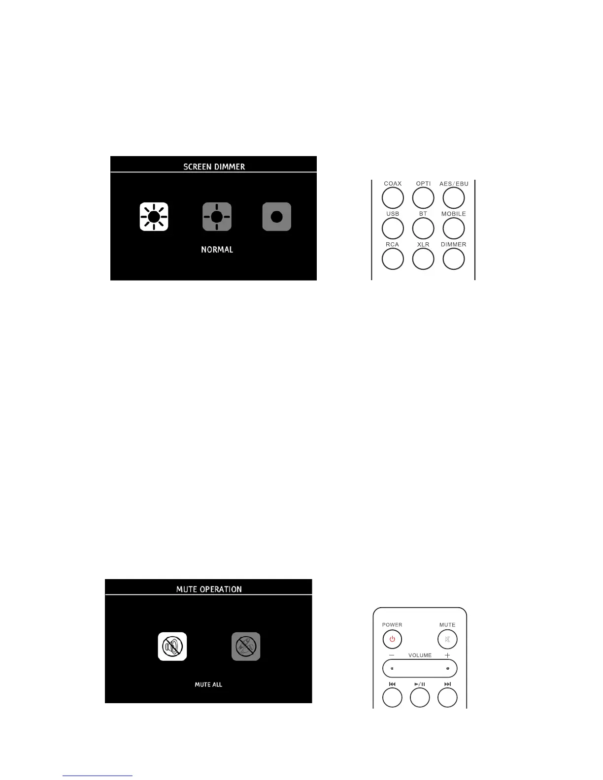 Mute All (default) – Both the Headphone Jack and Pre-amplifier Output are muted when the MUTE button