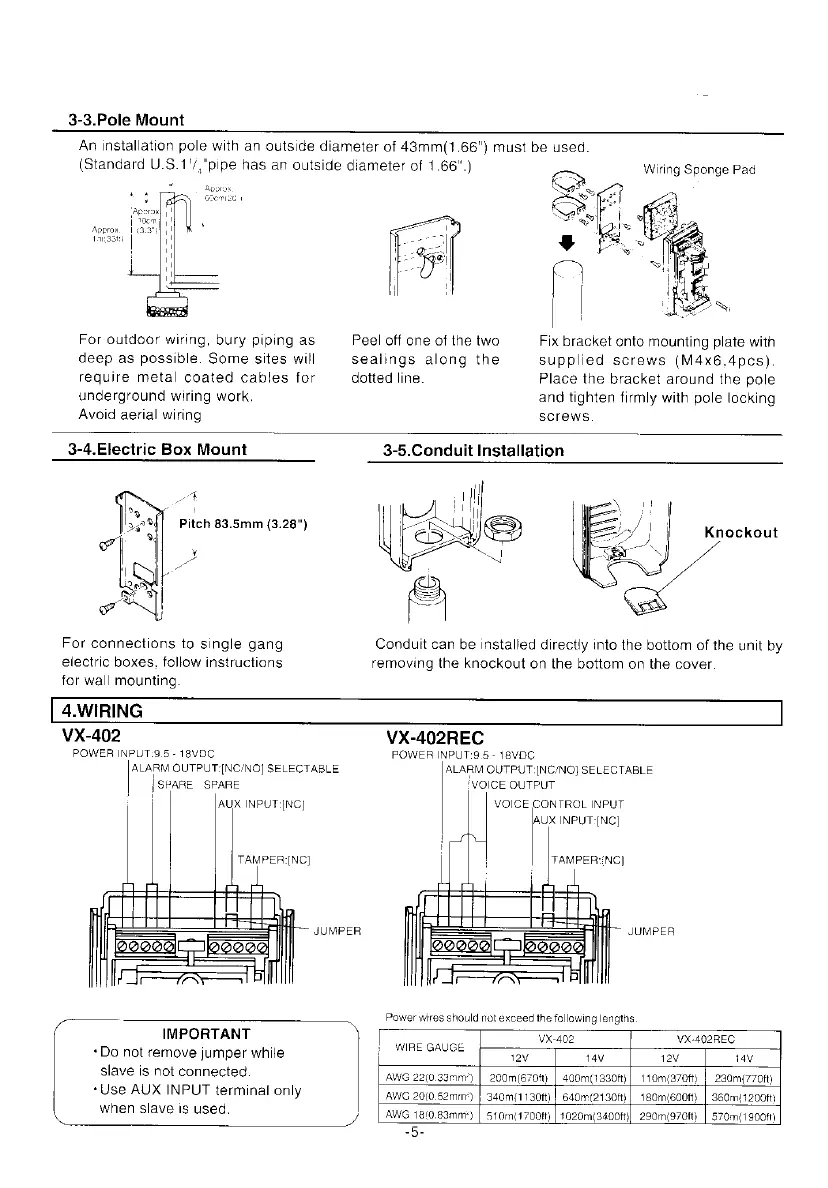 Optex VX-402 - Pole Mounting; Electric Box Mounting; Wiring and Connections