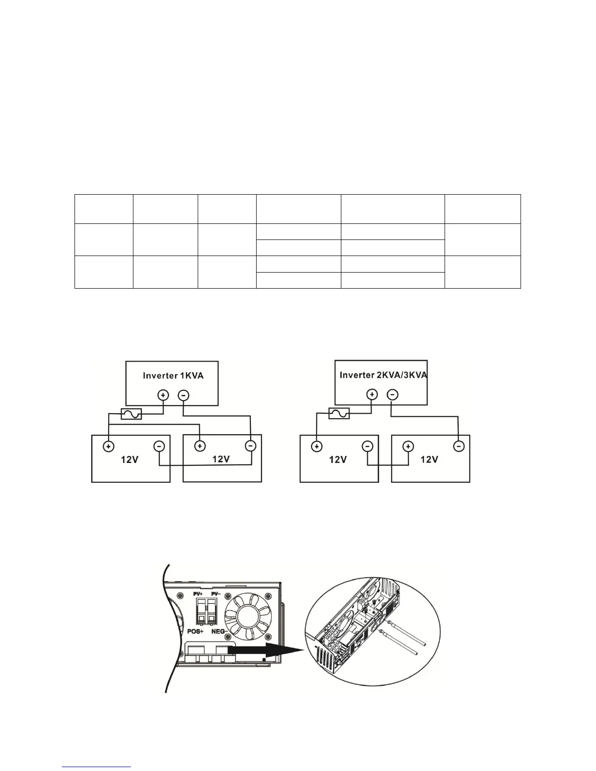 2. 1KVA model supports 12VDC system and 2KVA/3KVA model supports 24VDC system. Connect all battery
