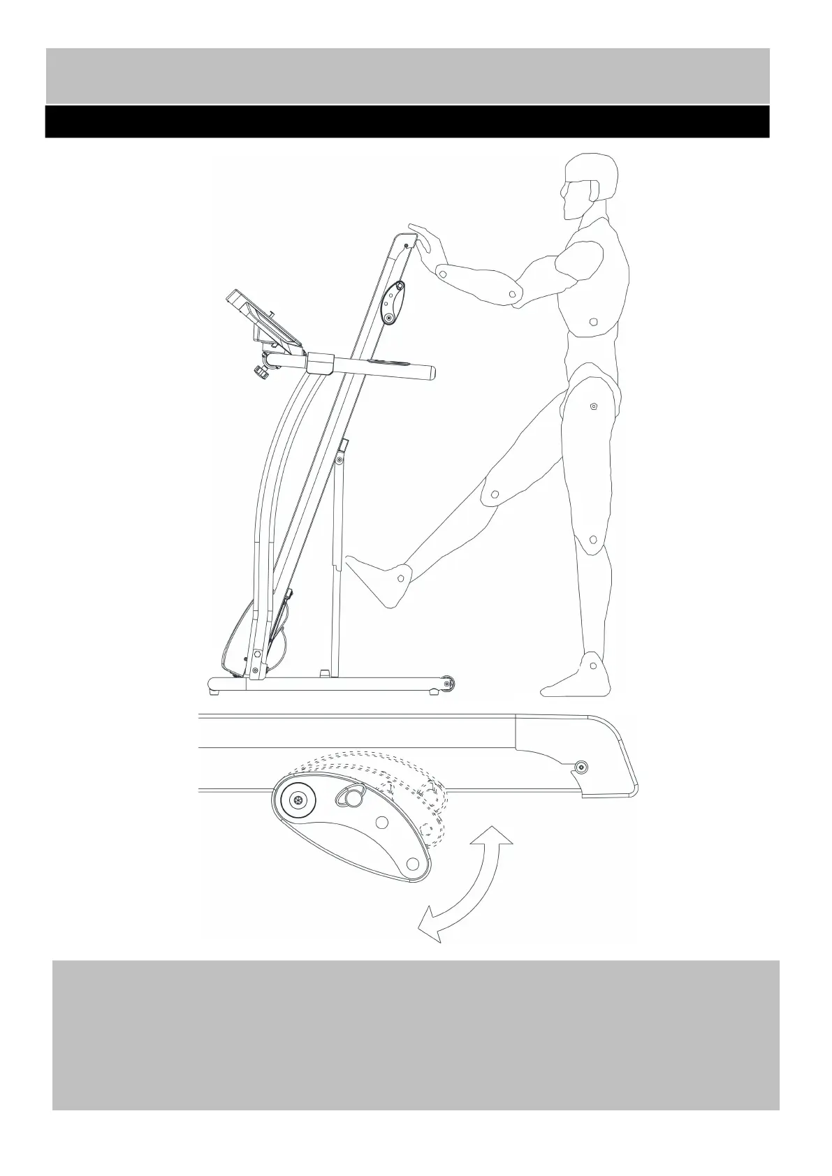 1. To fold the treadmill, lift the running deck and you can hear a click when the deck locks into position.