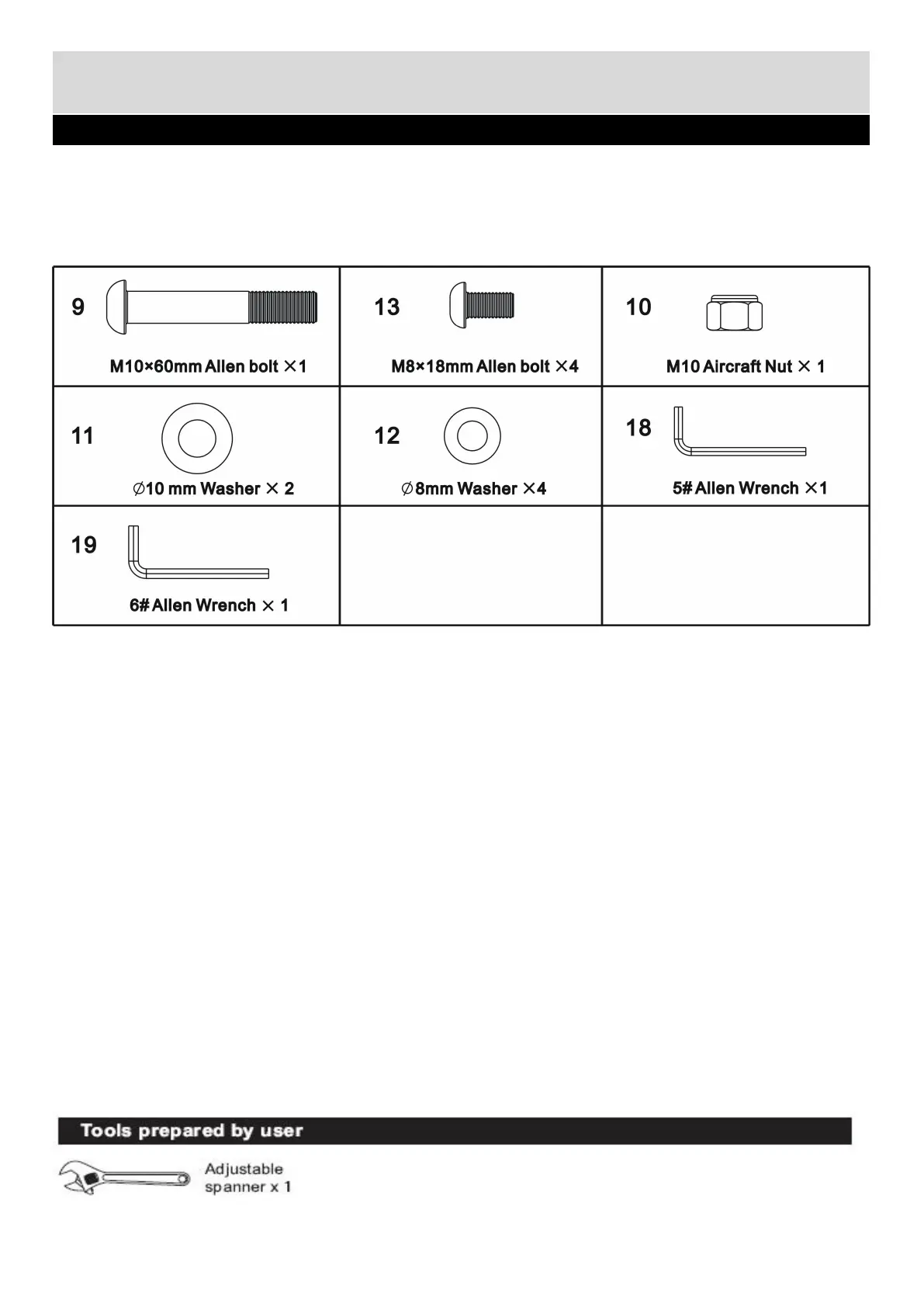 Note:The quantities below are the correct amount to complete the assembly. In some cases more hardware
