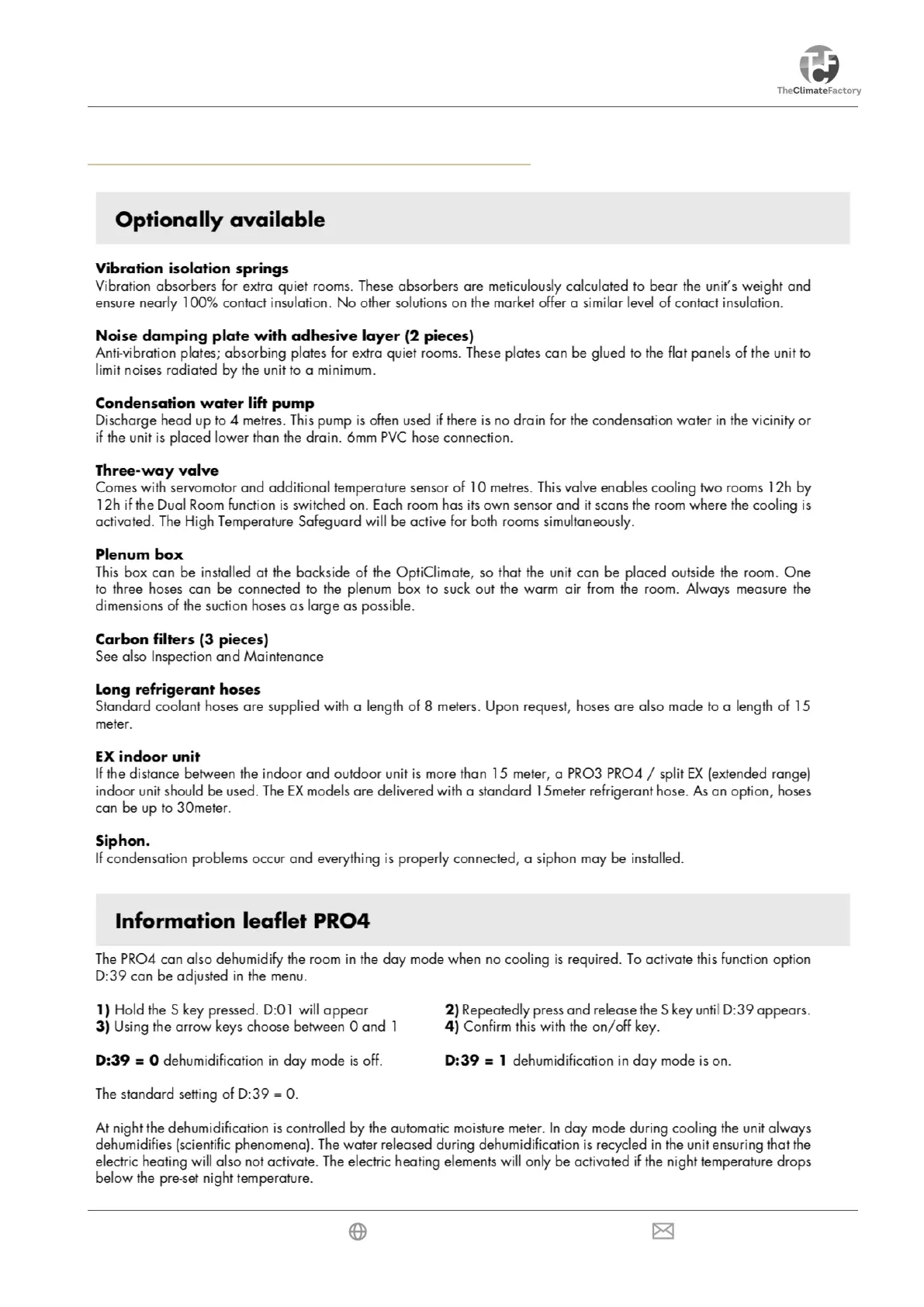 OPTICLIMATE PRO 3 - Optional Accessories and PRO4 Features; Optional Accessories Overview; PRO4 Specific Dehumidification Function