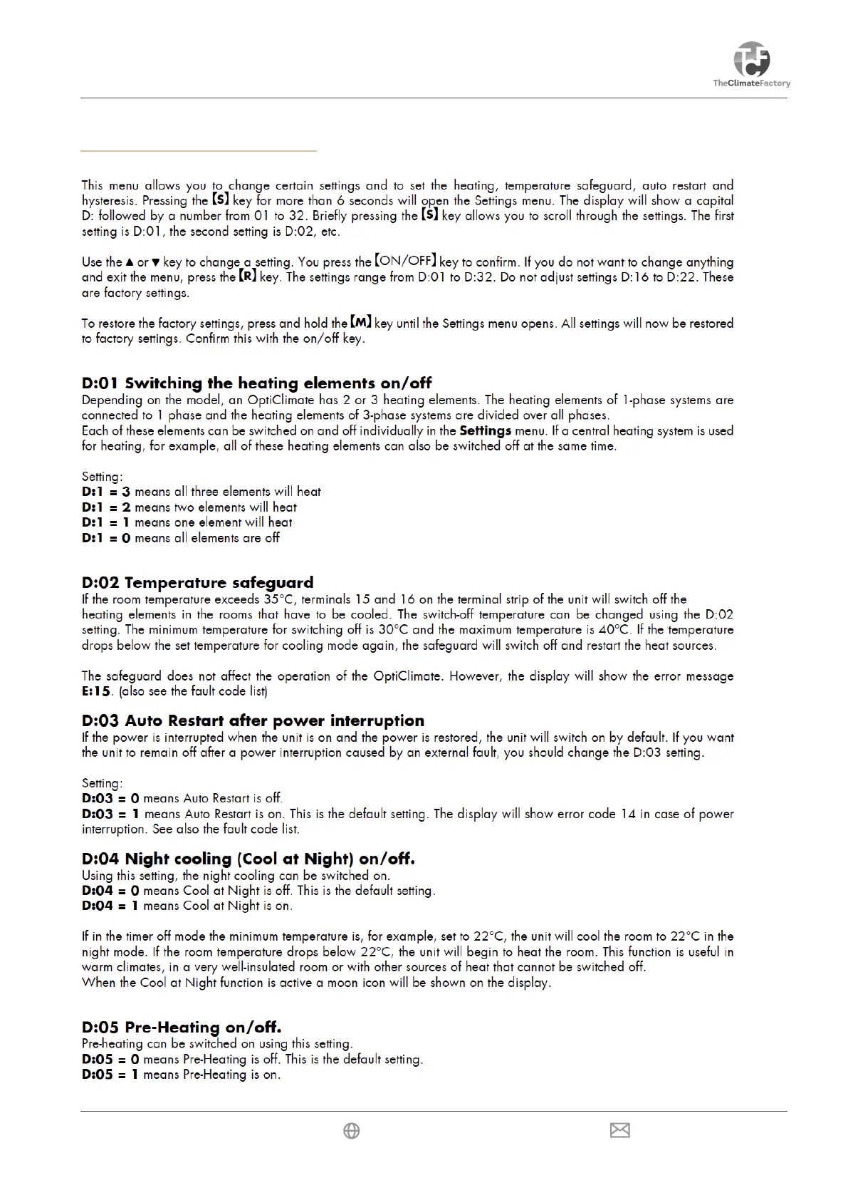 OPTICLIMATE PRO3 Series - Heating Element Control (D:01); Temperature Safeguard (D:02); Auto Restart Setting (D:03); Night Cooling (D:04)