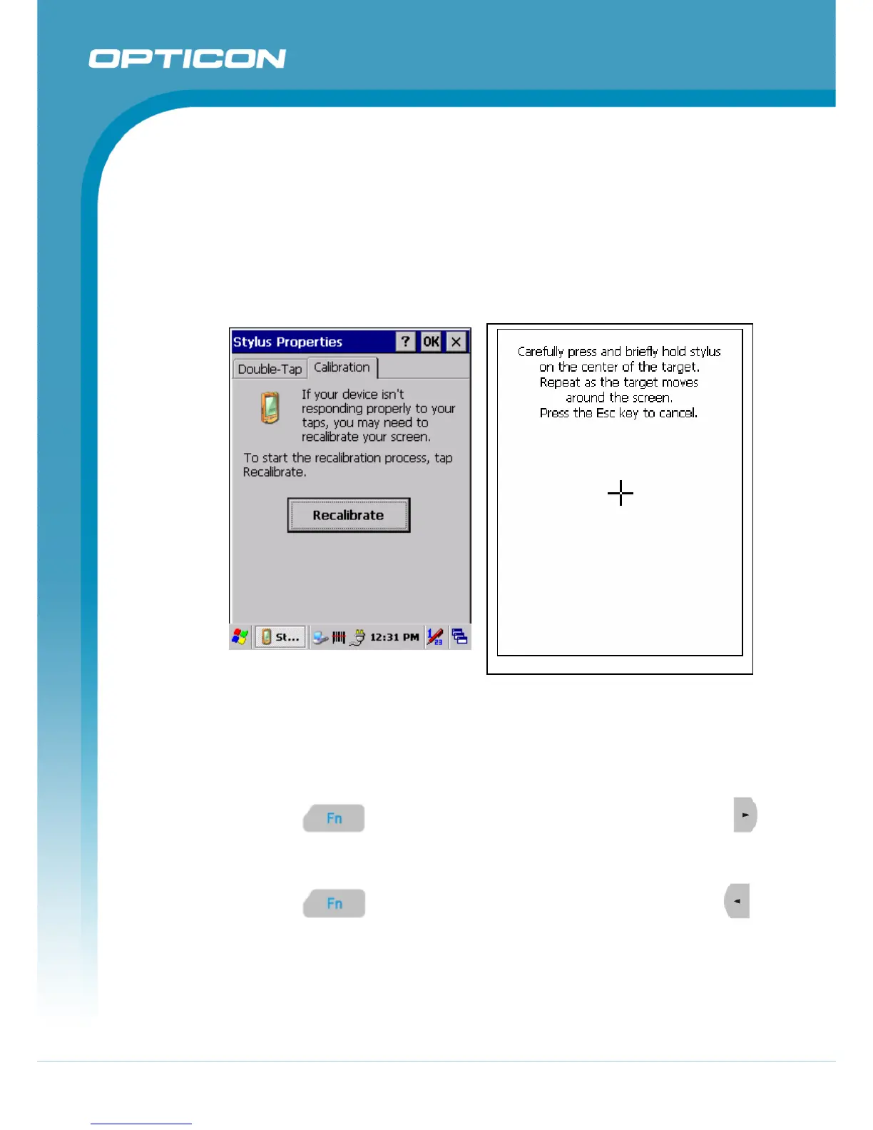 On the initial boot-up of the Terminal, the stylus calibration screen opens. Use the