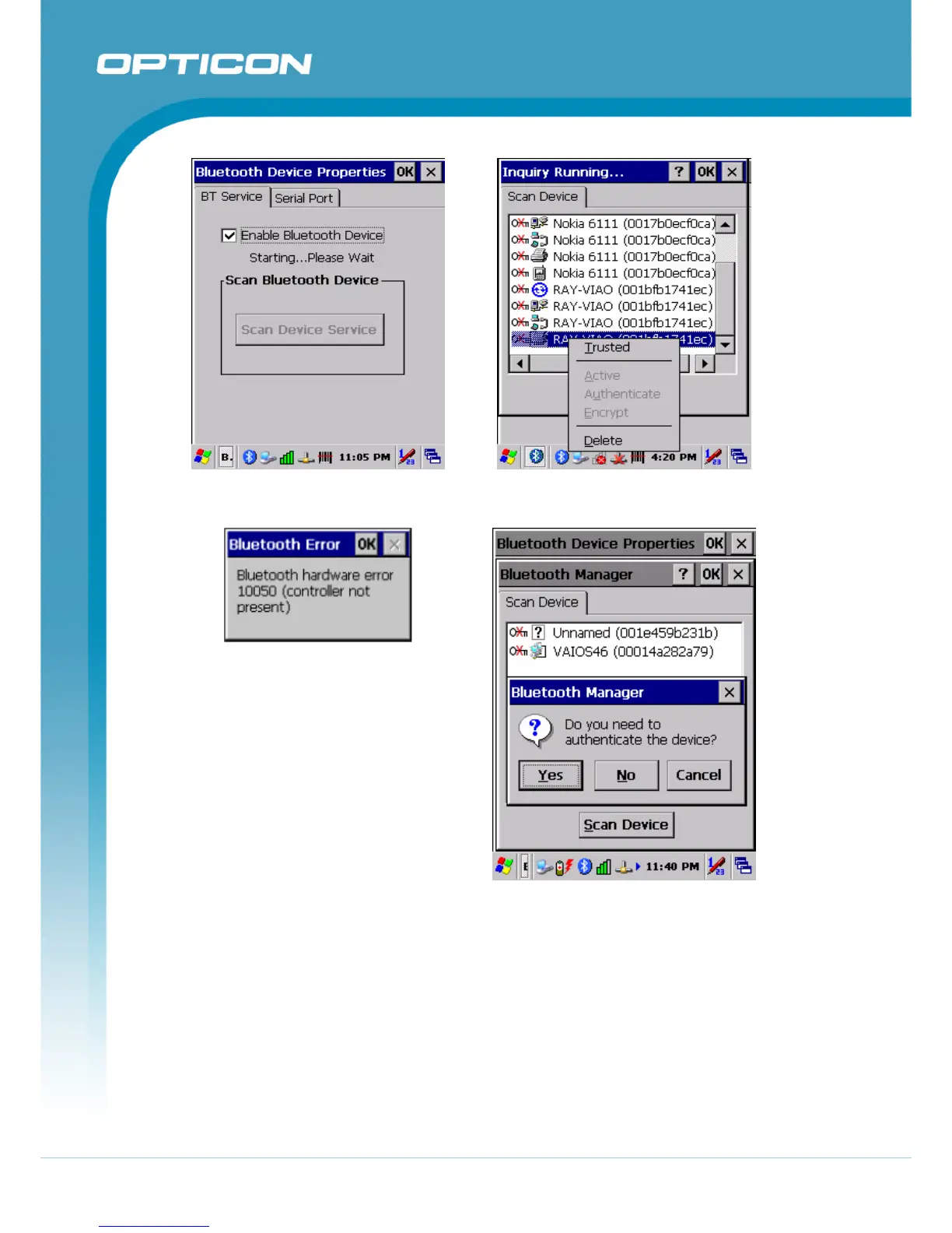Opticon H15 - Figure 3-1. BT Service - Enable Bluetooth Device; Figure 3-2. BT Service - Bluetooth Manager Scan Inquiry; Figure 3-3. BT Service - Bluetooth Hardware Error; Figure 3-4. BT Service - Bluetooth Authentication Error