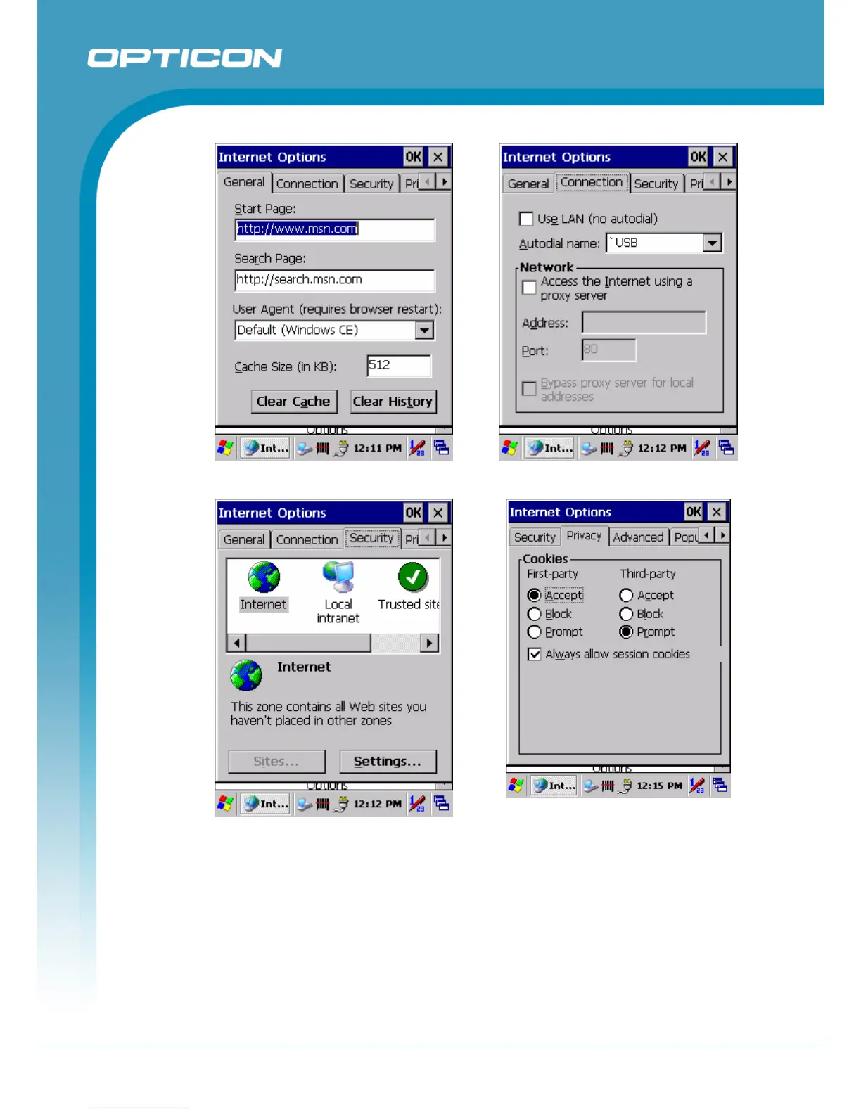 Opticon H15 - Figure 3-38. Internet Settings General; Figure 3-39. Internet Settings Connection; Figure 3-40. Internet Settings Security; Figure 3-41. Internet Settings Privacy