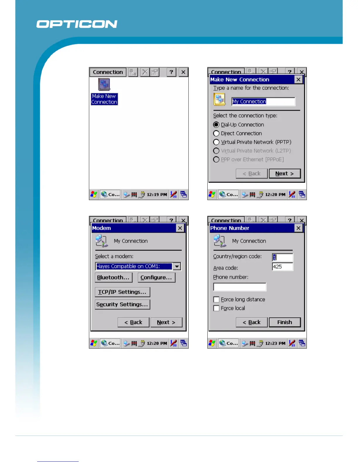 Opticon H15 - Figure 3-45. Connection Icon; Figure 3-46. Make New Connection; Figure 3-47. Modem; Figure 3-48. Phone Number