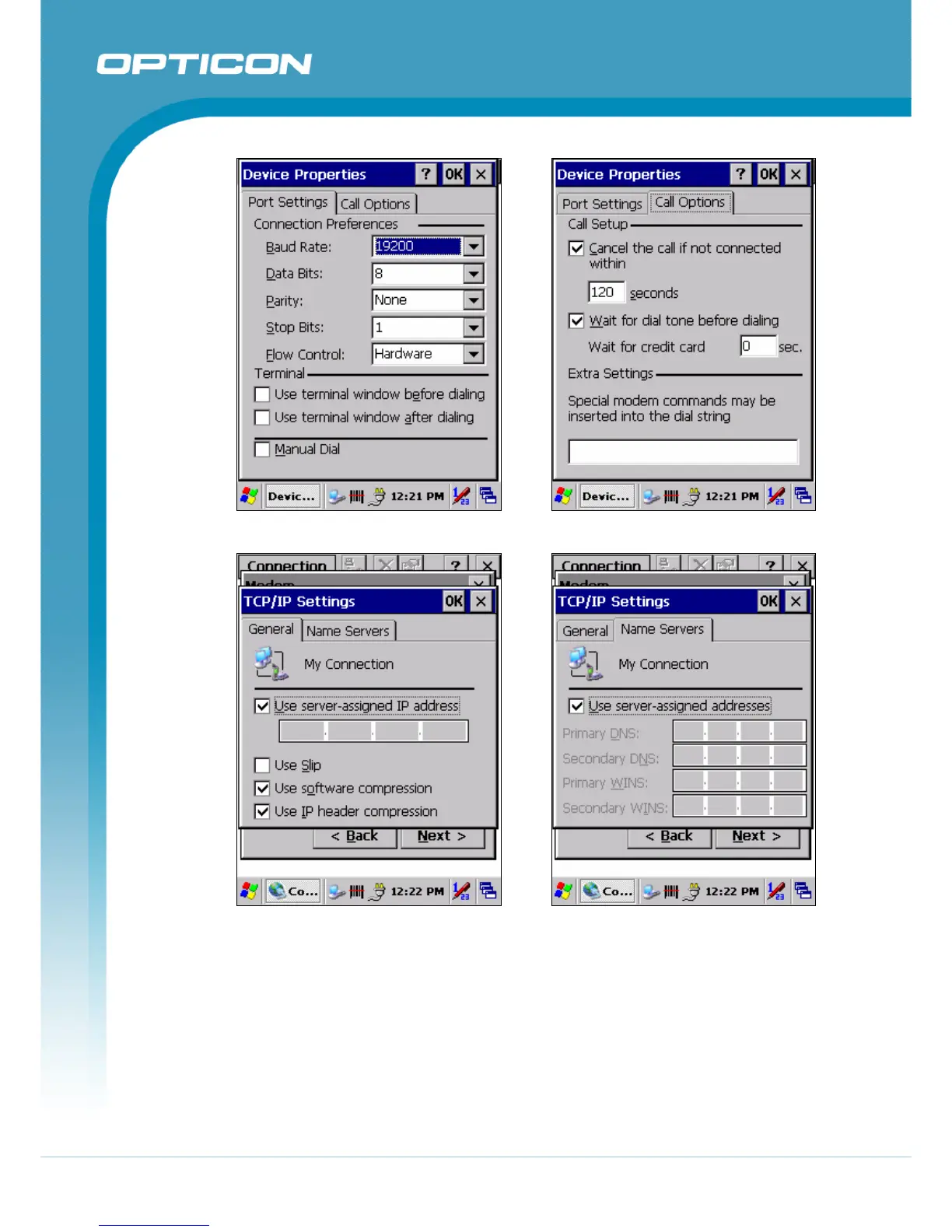 Opticon H15 - Figure 3-49. Port Settings; Figure 3-50. Call Options; Figure 3-51. TCP;IP Settings - General; Figure 3-52. TCP;IP Settings - Name Servers