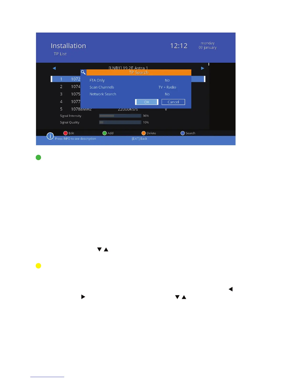 TP search Transponder scan. Press the green button to scan the