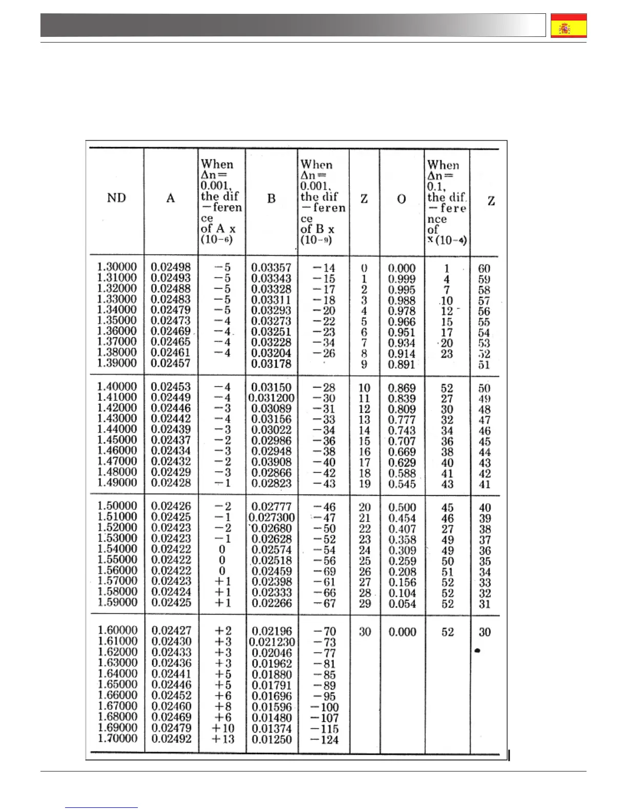 Tabella 1: Tabla de los valores de dispersión para el refractómetro de Abbe. Fórmula para