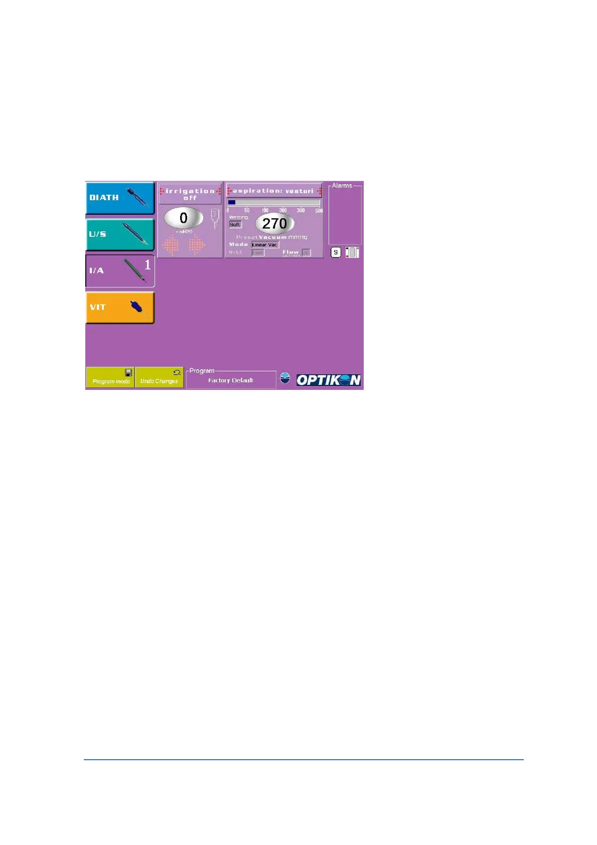 Irrigation/Aspiration window will display preset Vacuum level, Aspiration mode,