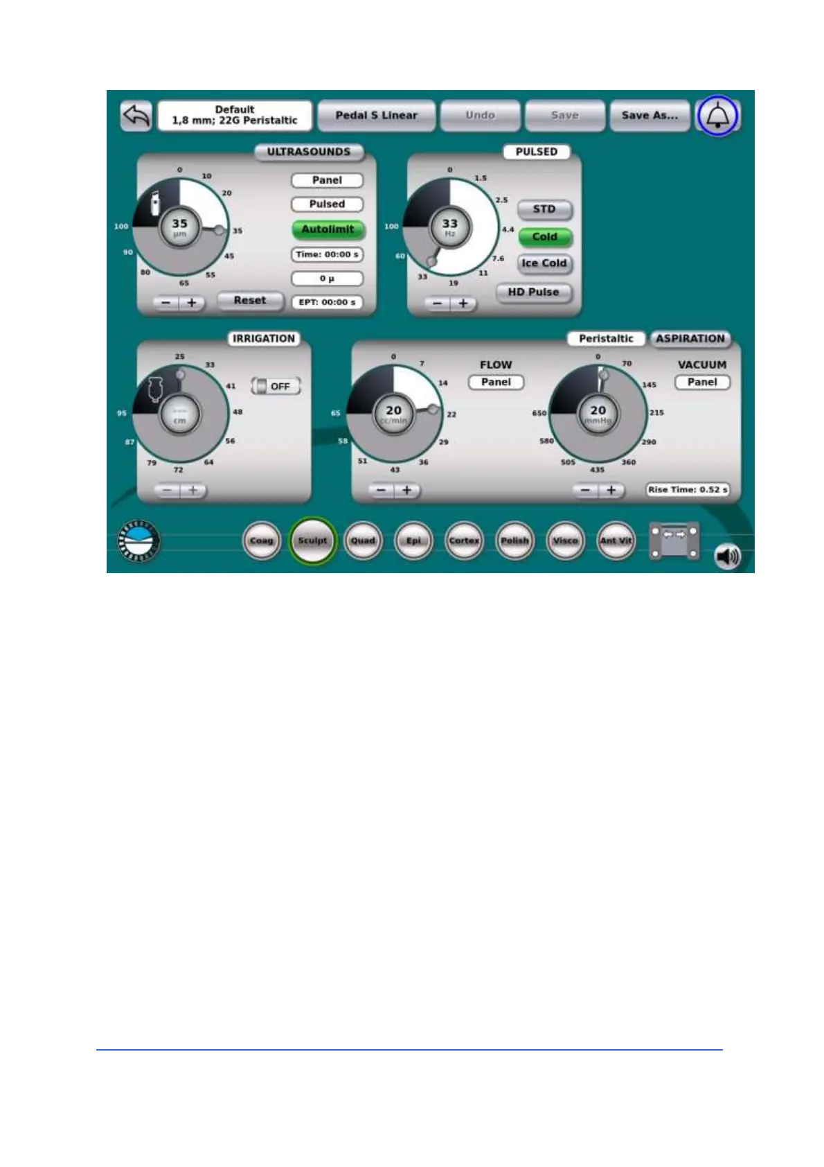 In Ultrasound mode, in addition to the irrigation and aspiration parameters described