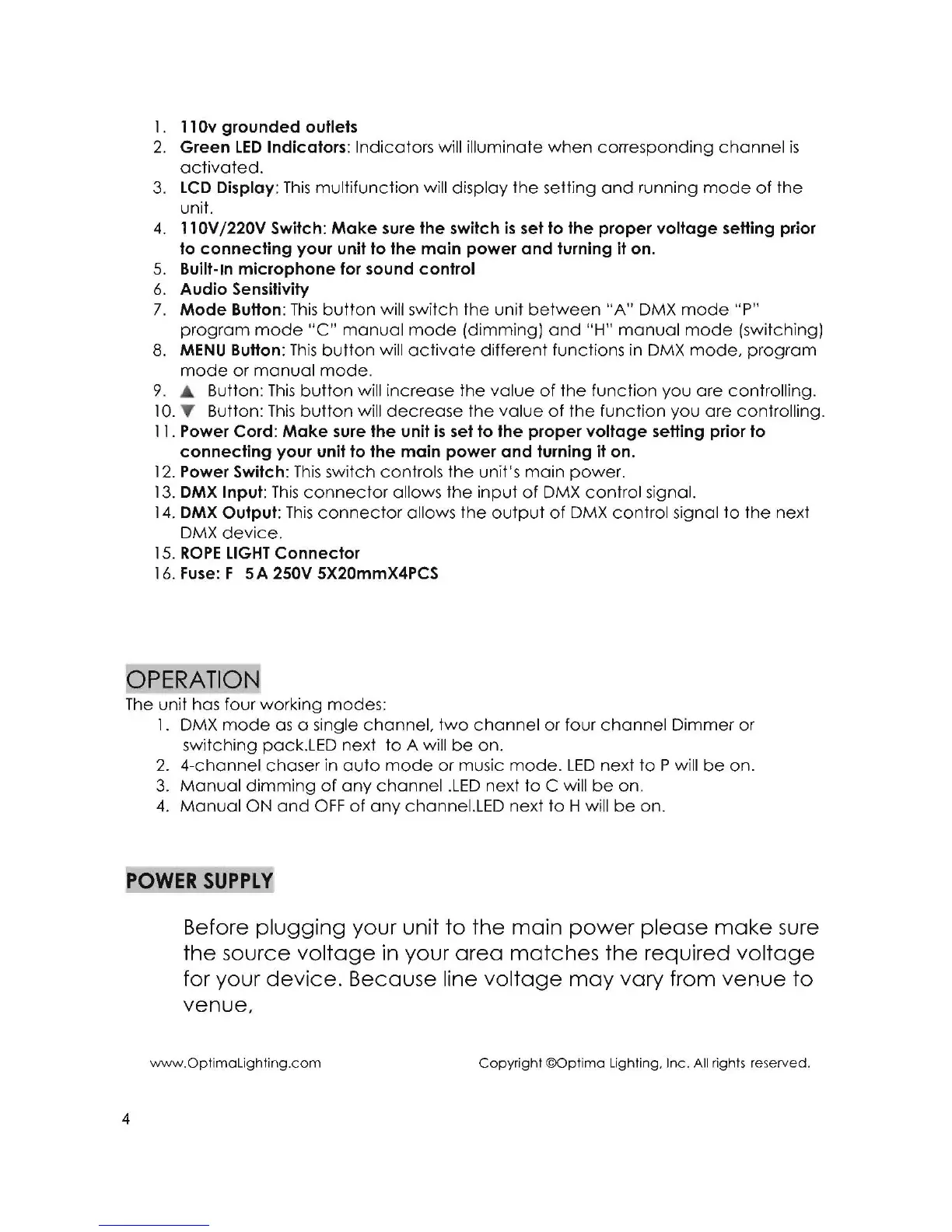 Optima Lighting Matrix DMX PRO+ - Product Operation Modes; Power Supply and Voltage Settings