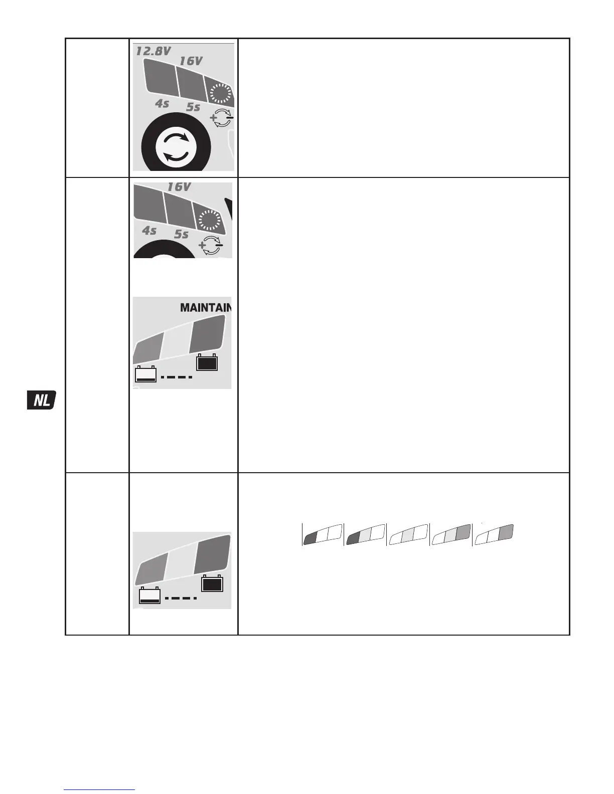 (d.w.z. wanneer ‘12,8 V’ is geselecteerd, gaat de led ‘12,8 V’ branden).