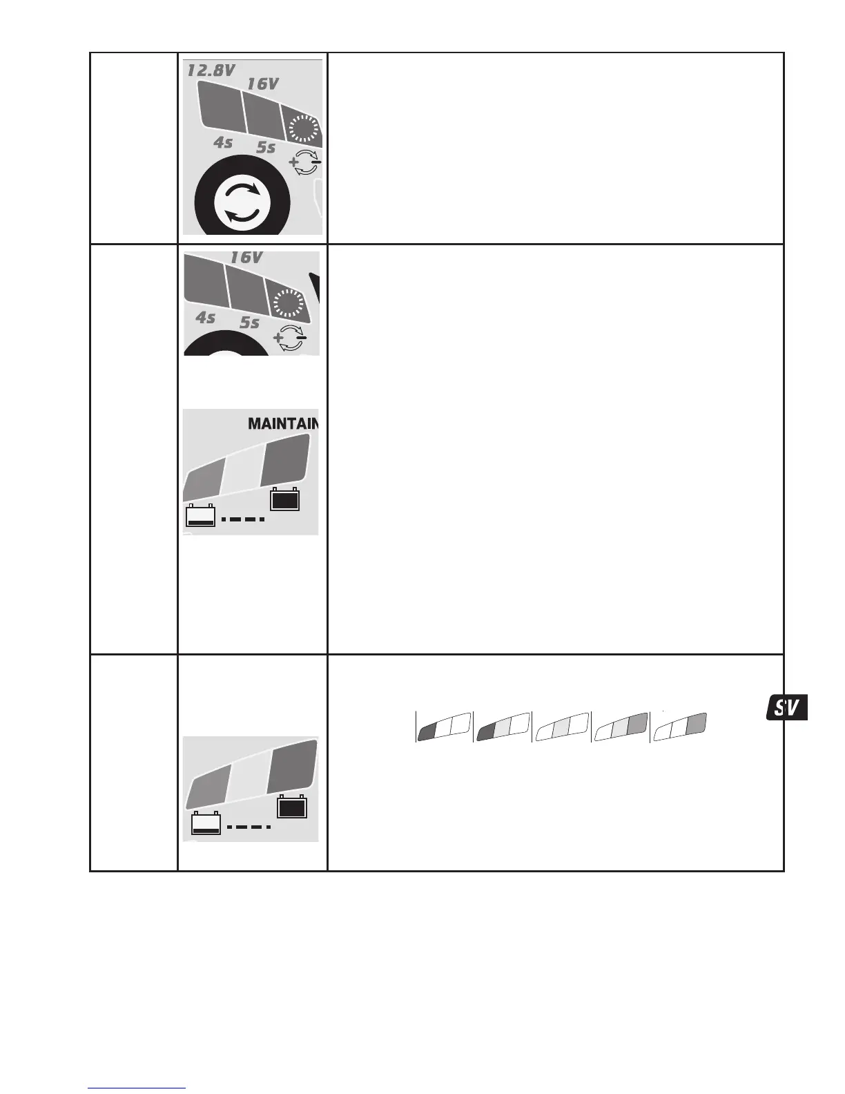 Lysdioden för vald spänning tänds. (om “12,8 V” väljs, tänds lysdioden för “12,8 V”).