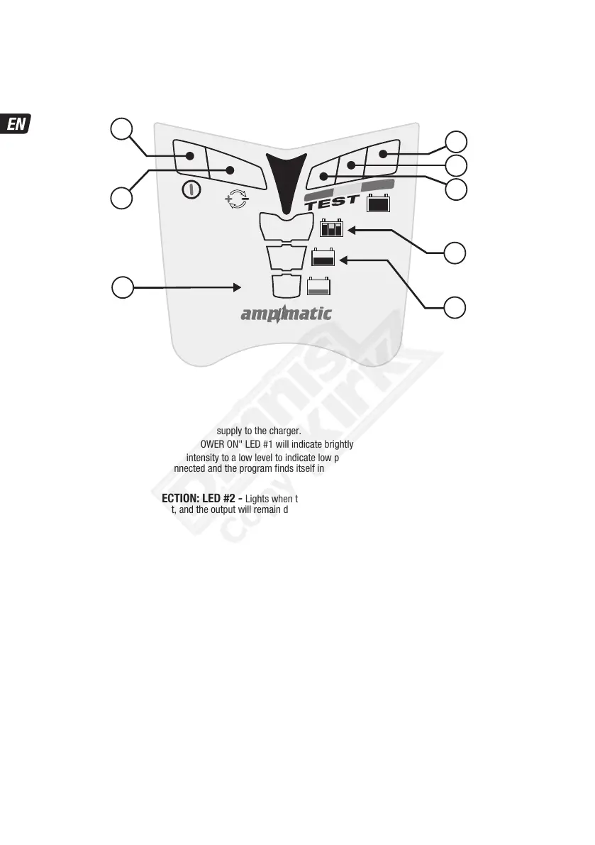 REVERSE POLARITY PROTECTION: LED #2 - Lights when the battery connections are incorrect. The charger is electronically
