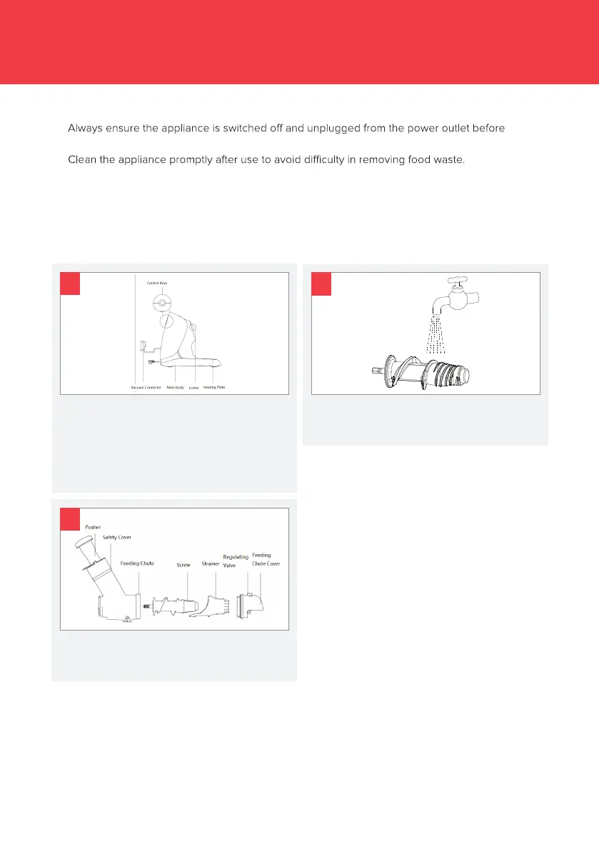 • Disassemble the appliance before cleaning, according to the instructions below:
