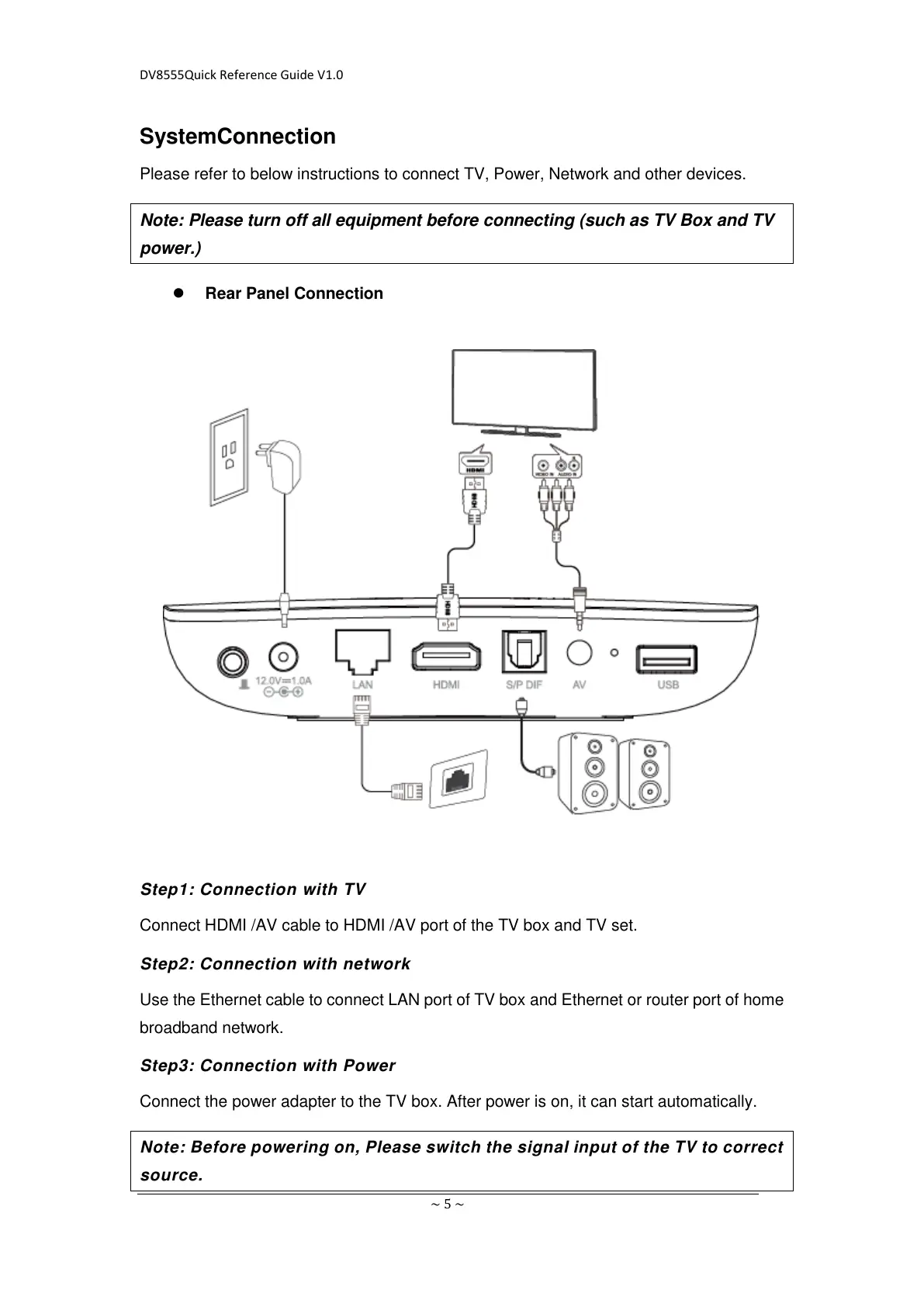 Note: Please turn off all equipment before connecting (such as TV Box and TV
