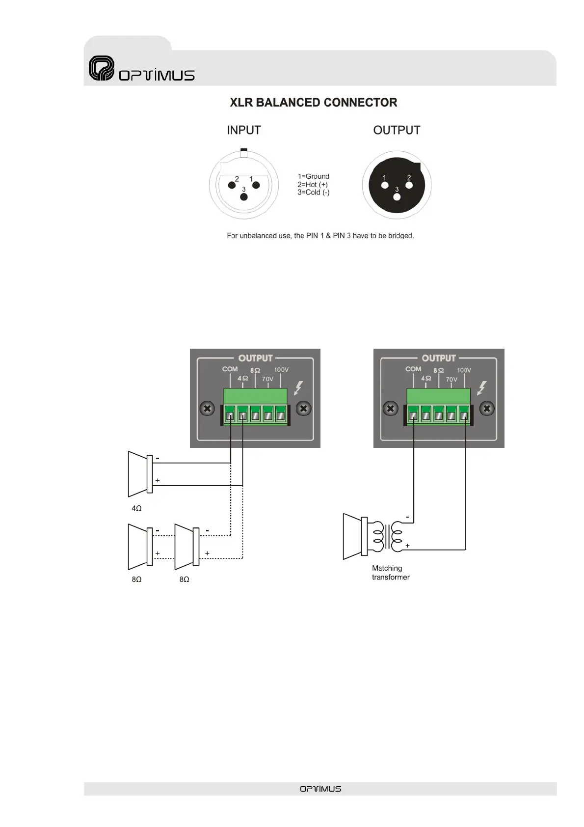 The equipment includes two low impedance terminals 4 Ω and 8 Ω, and two high impedance