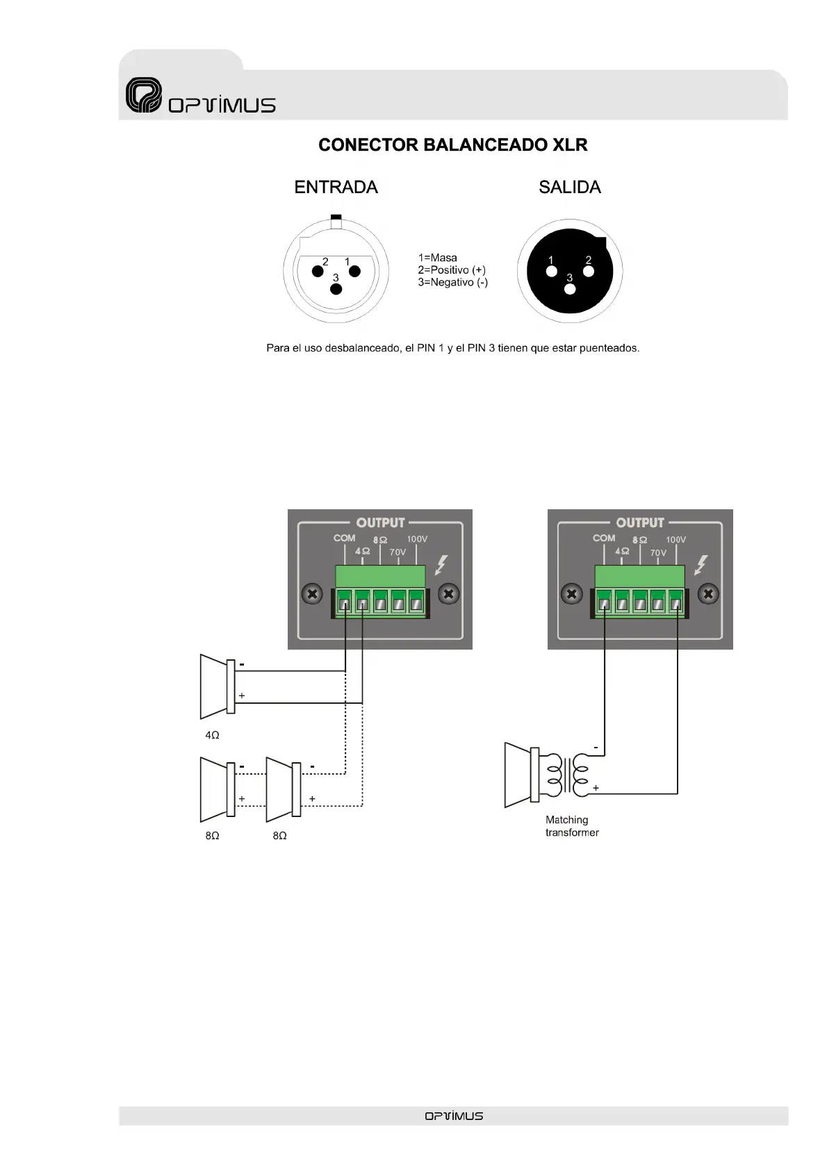 El equipo incluye dos terminales de baja impedancia 4 and 8 , y tos terminales de alta
