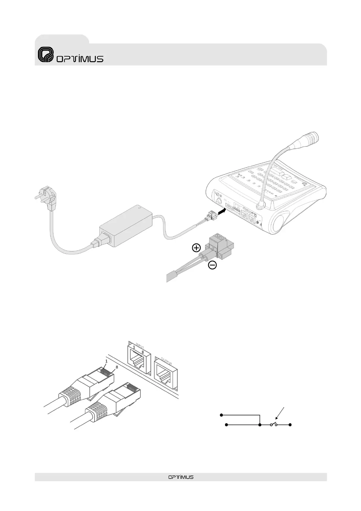 A través de los conectores RJ45 INPUT y OUTPUT, el pupitre transmite y recibe las señales de audio y de comunicación CAN hacia el