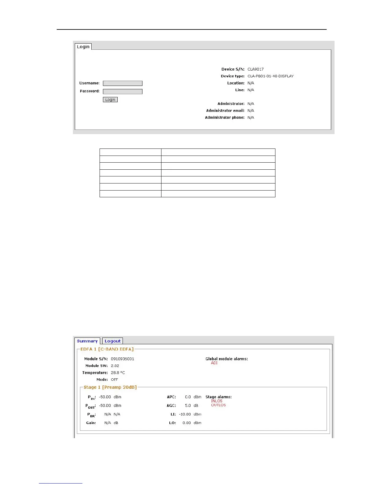 EDFA unit parameters – SN, Pin, Pou, Temperatures, ALARMS