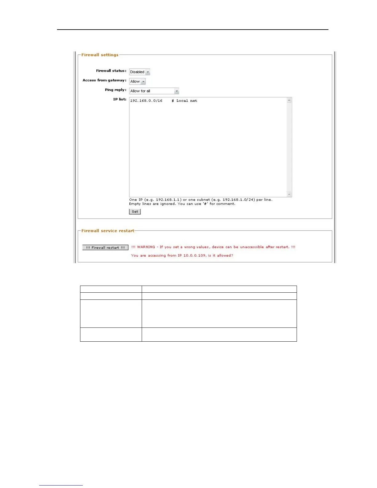 NOTICE: For accept changes in firewall system click to button “Firewall restart”