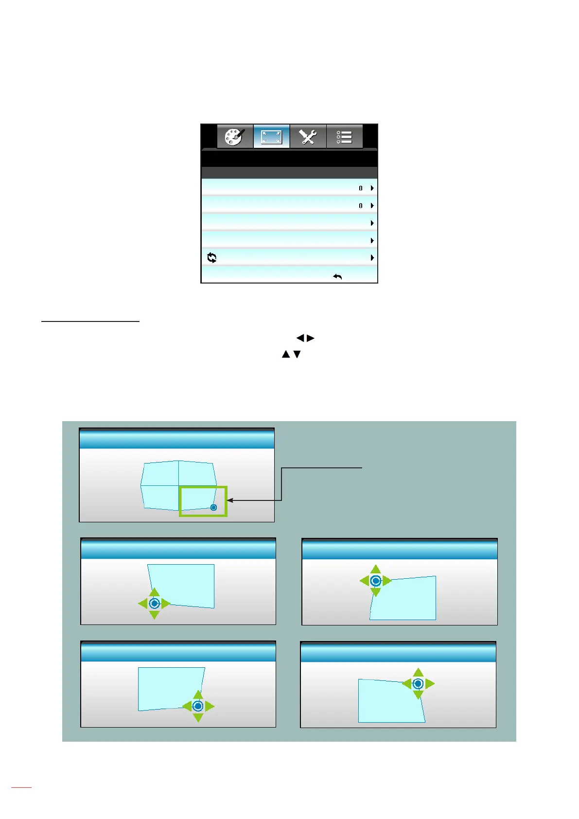Four Corner: Compensate for image distortion by adjusting one corner at a time.