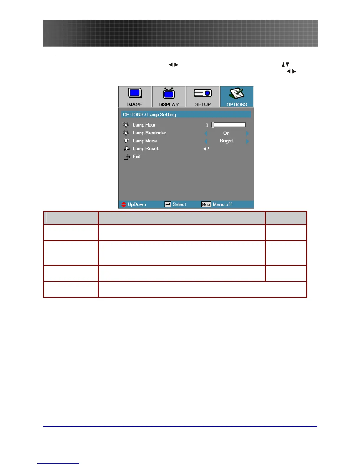 up and down in the OPTIONS menu. Select Lamp Setting in the OPTIONS menu. Press