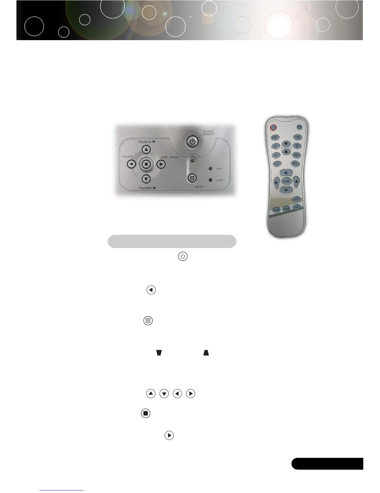 Refer to the “Power On/Off the Projector” section on pages