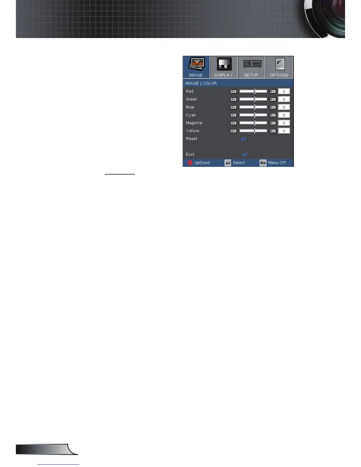 Adjusts the Red, Green, Blue, Cyan, Magenta and Yellow colors or