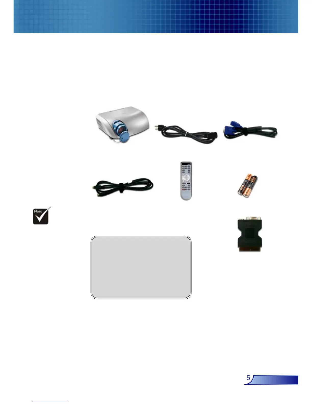 This projector comes with all the items shown below. Check to