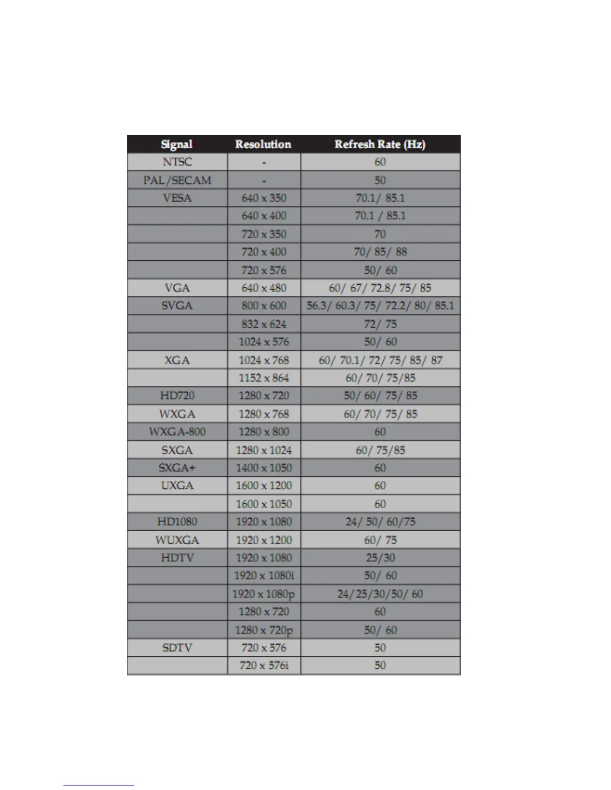 Optoma ES522 - 10-3 Factory Preset Display Modes