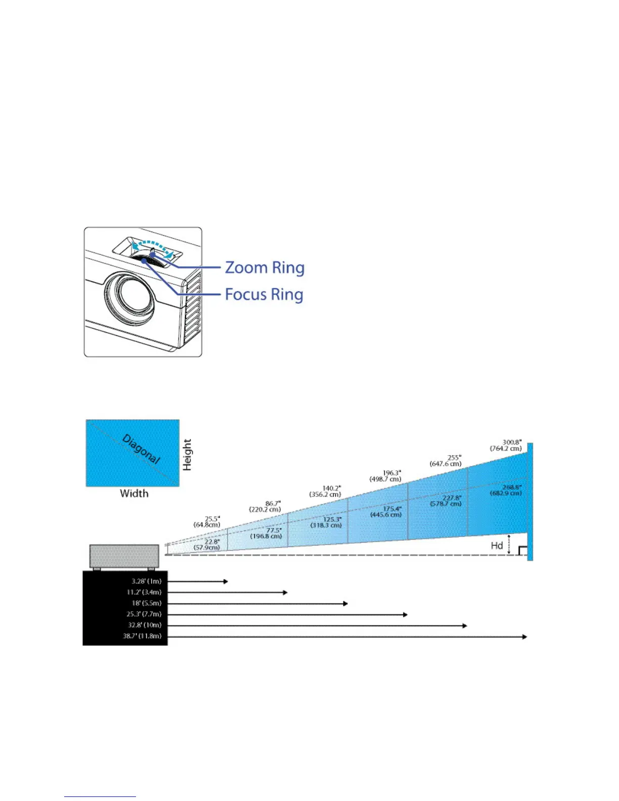 The projector will focus at distances from 3.28 to 38.7 feet (1.0 to 11.8 meters).