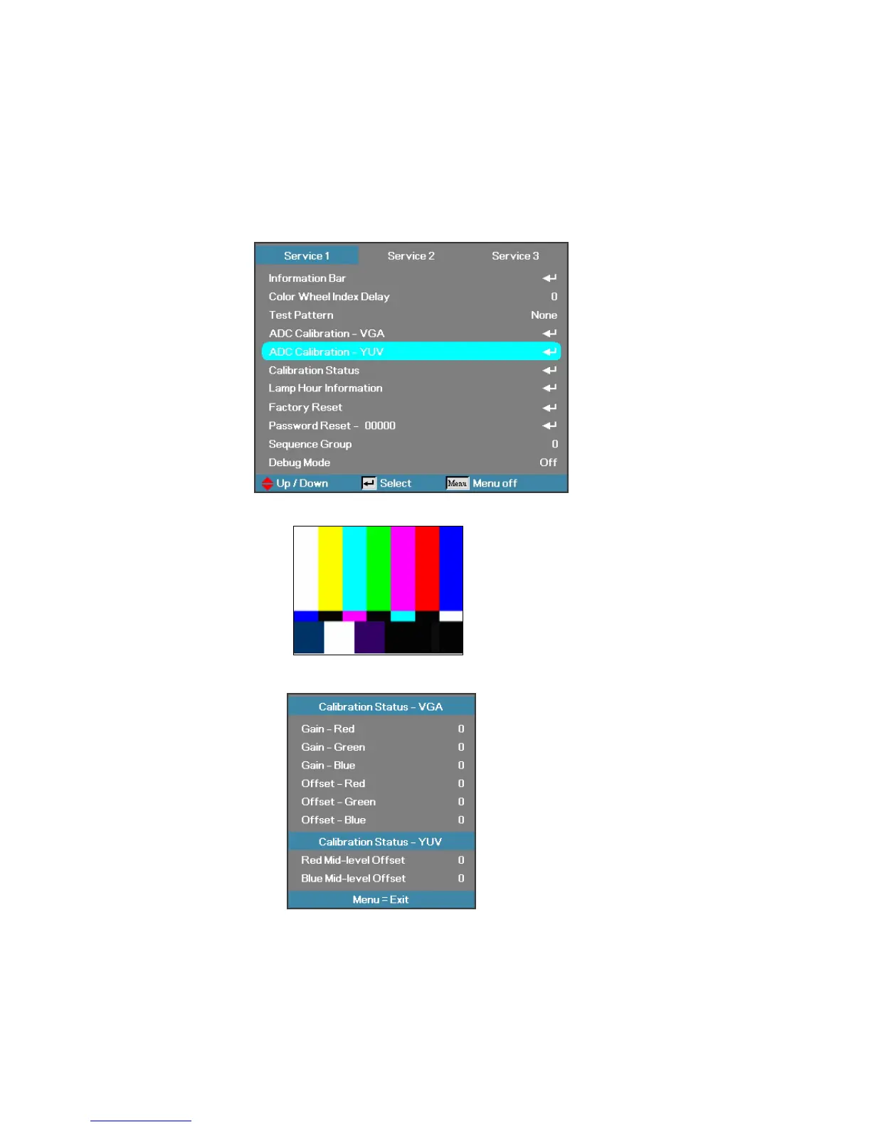 Step 1: In Service 1 Mode select ADC Calibration - YUV. In this menu input pattern with 75﹪SMPTE