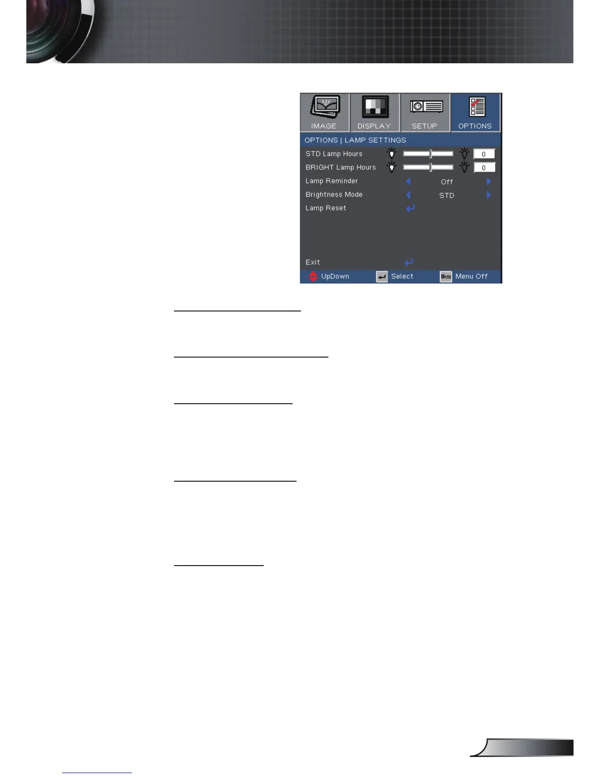 STD: Choose “STD” to dim the projector lamp which will lower