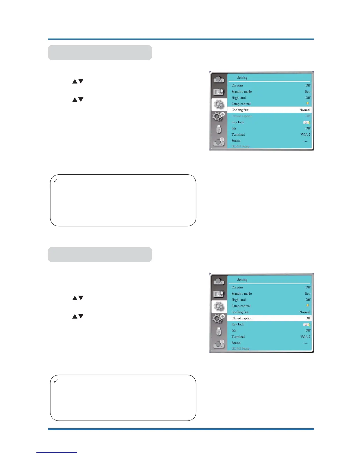 After your projector is powered off, select cooling fan