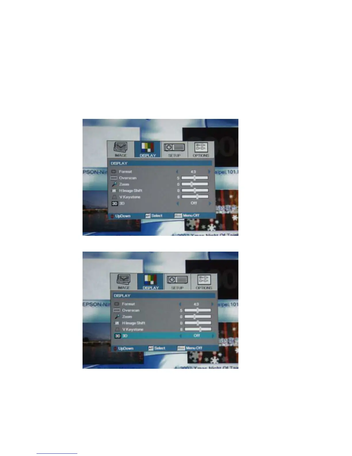 Step 2. Press the “MENU” button, select “DISPLAY”, then press